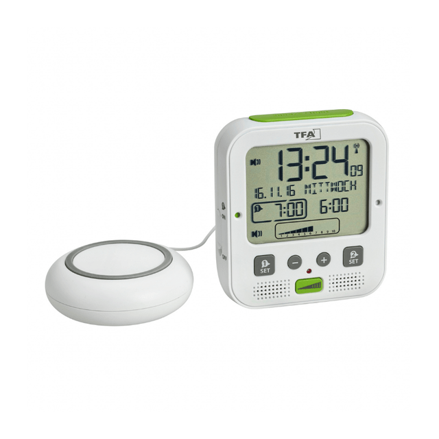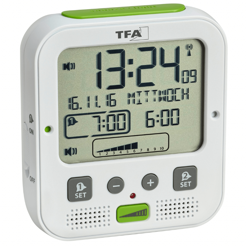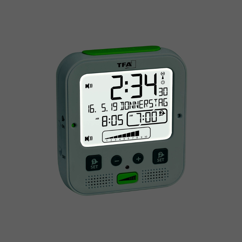 Dette trådløse vækkeur er udviklet til dig, der har brug for en ekstra effektivt alarm. Uret kombinerer høj lyd, kraftige vibrationer og blinkende lys – så du med sikkerhed vågner til tiden, uanset om du sover tungt eller har nedsat hørelse. Alle disse funktioner kan kombineres med hinanden og justeres individuelt.