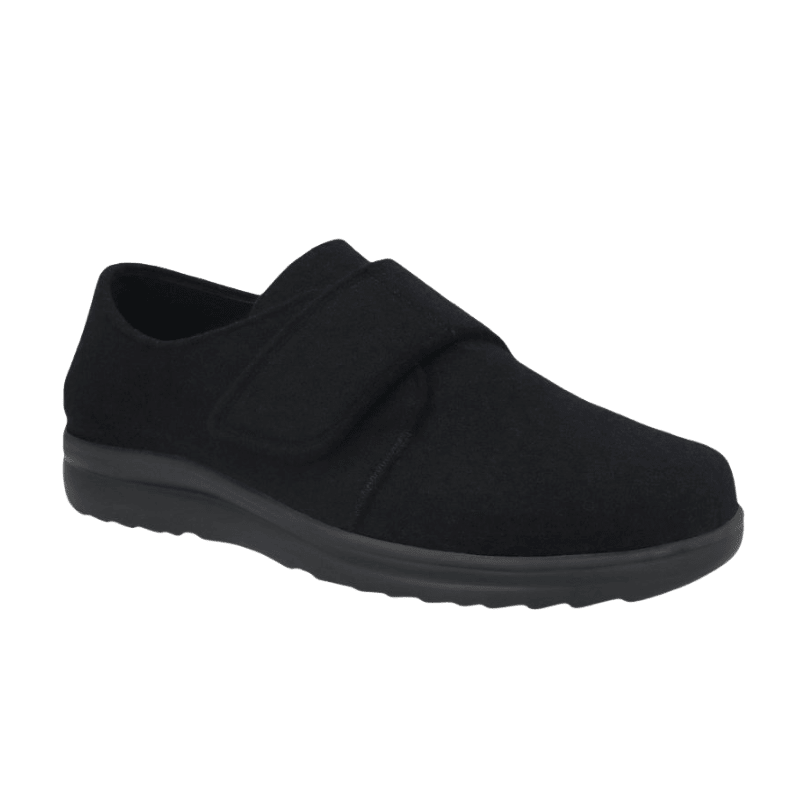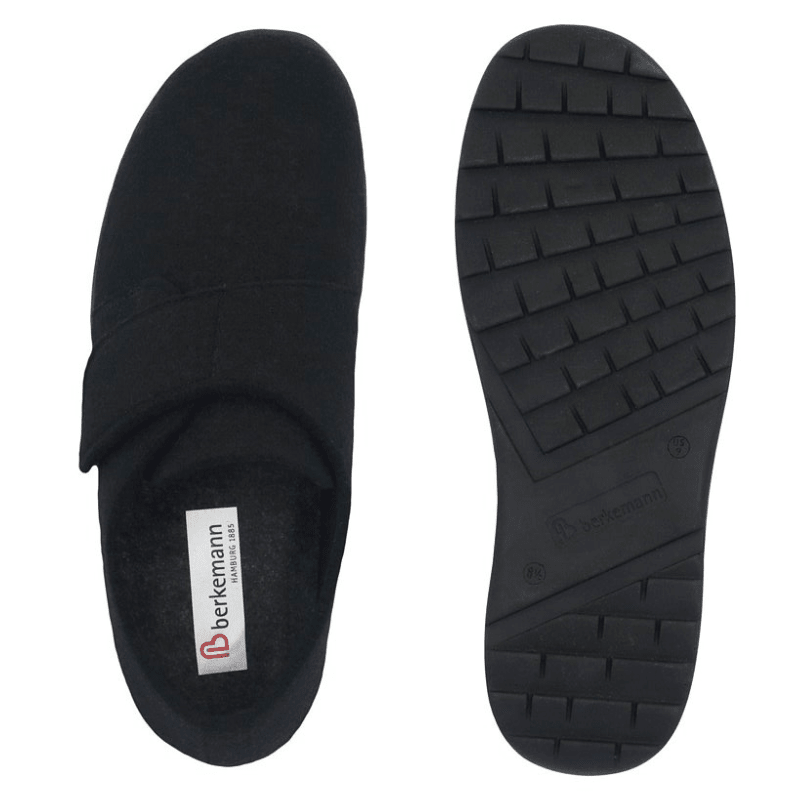Zapatillas de casa Berkemann en fieltro oscuro, con cierre de velcro práctico para que sean muy fáciles de poner, quitar y ajustar perfectamente al pie.