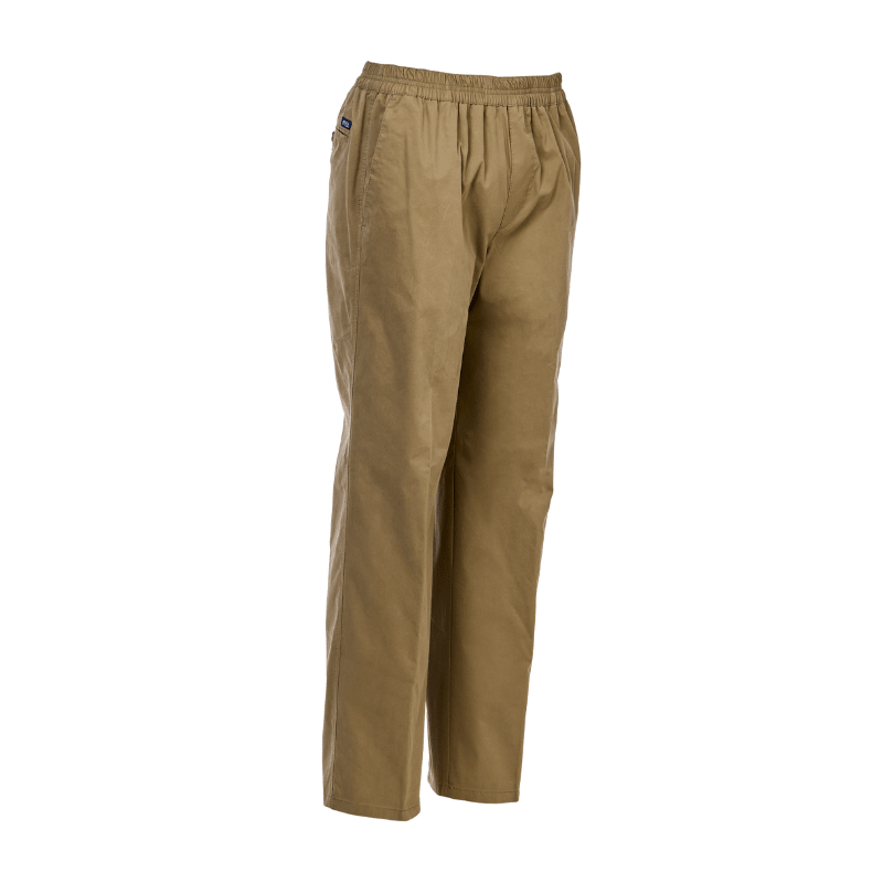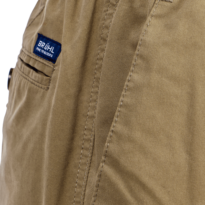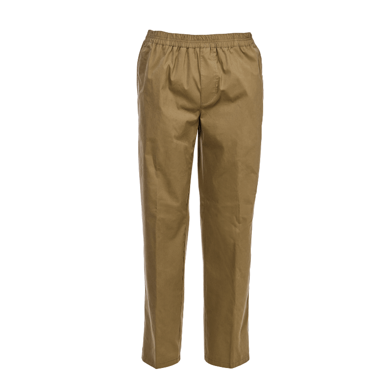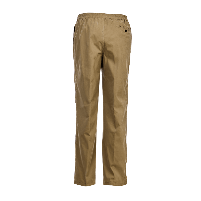 Pantalones clásicos y ultraligeros en color beige de Brühl, confeccionados en un tejido suave con cintura elástica, sin botones ni cremallera. Incluyen dos bolsillos frontales profundos y un único bolsillo trasero con cierre de botón.