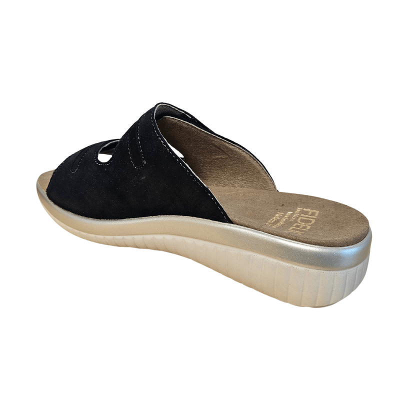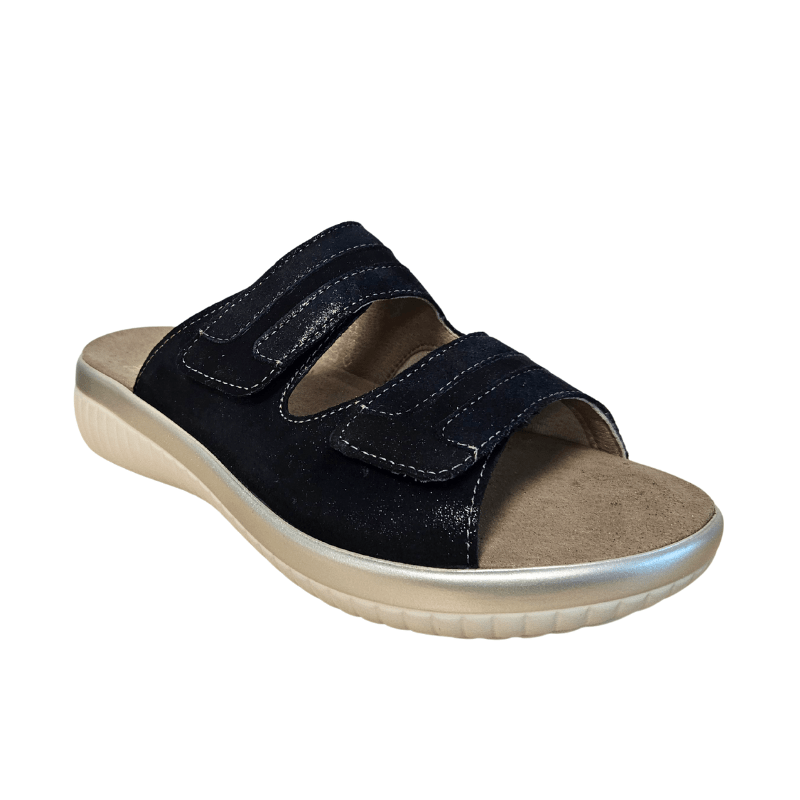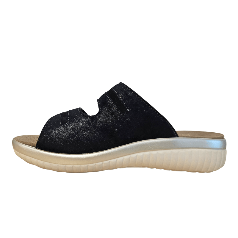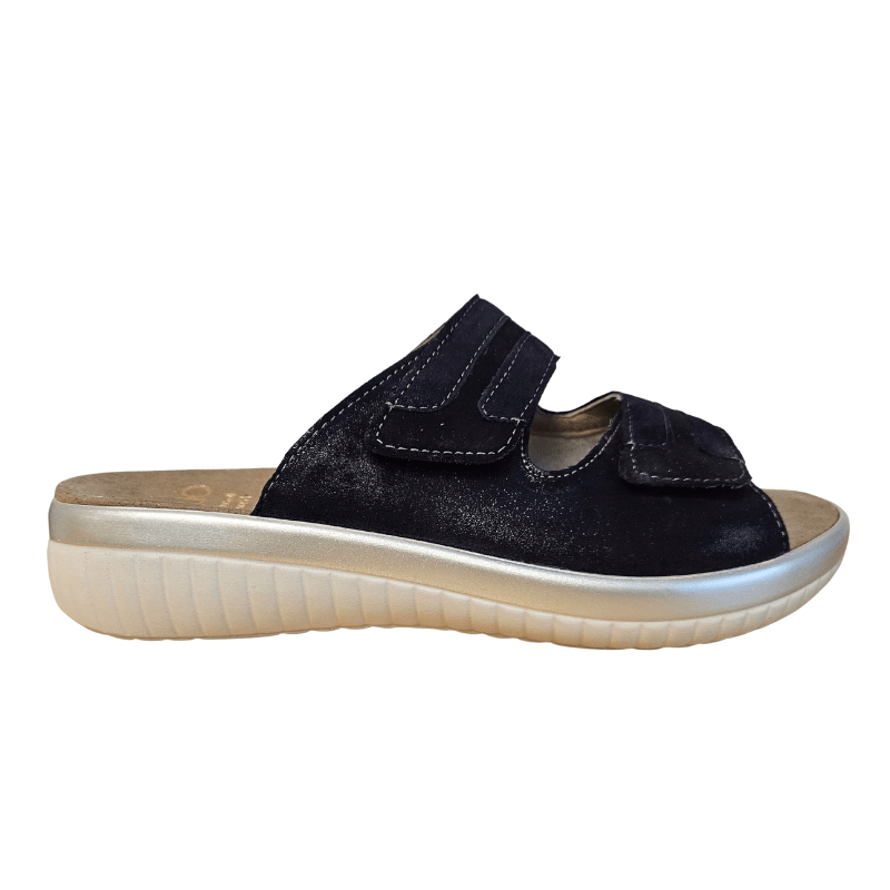 Sandalia femenina cómoda con una parte superior suave y flexible de gamuza negra, además de una suela blanca con un elegante detalle en franja plateada. Gracias a las dos correas ajustables de velcro sobre el empeine, es fácil ajustar el calce.