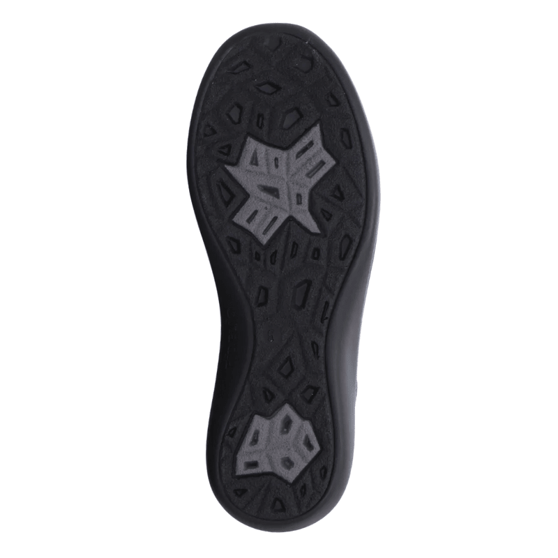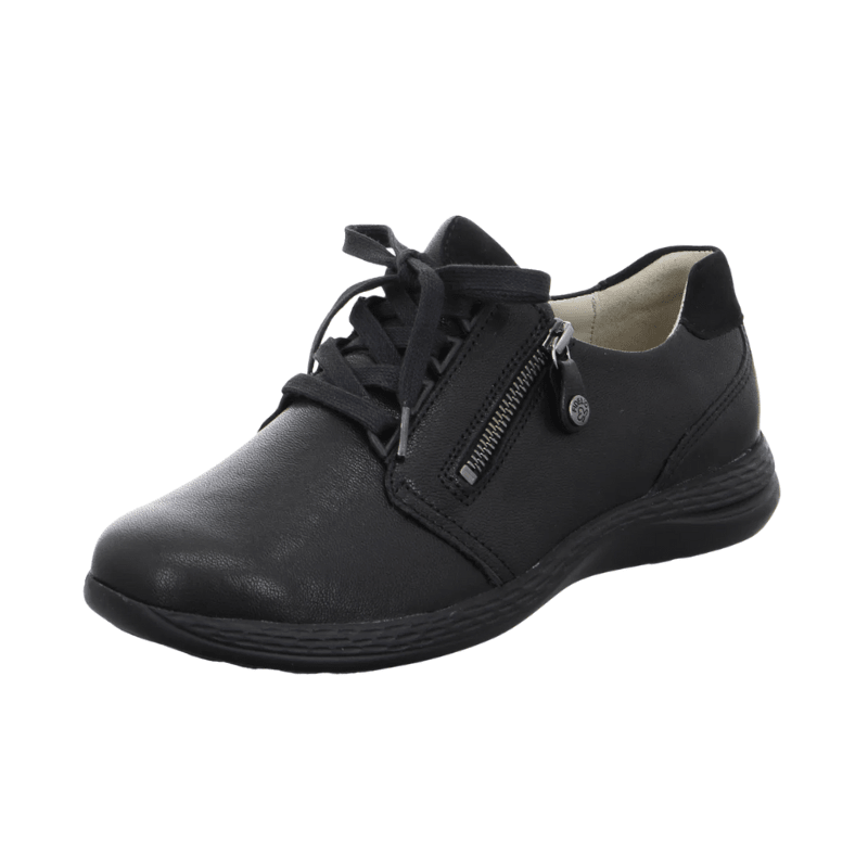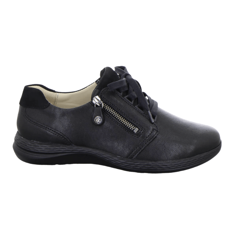 Zapatilla Fidelio negra con parte superior de cuero y tejido multi-stretch para máxima comodidad, durabilidad y flexibilidad. Incorpora cordones y una cremallera lateral para mayor practicidad, ideal para el uso diario.