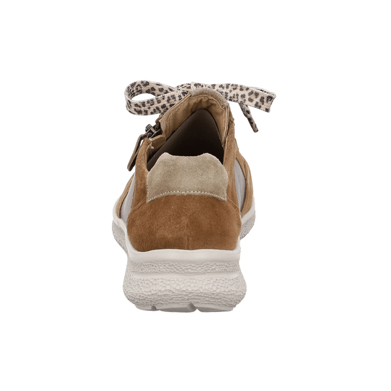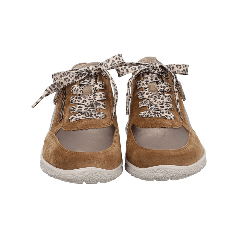 Zapatilla para mujer color marrón, de diseño moderno y atemporal, con un sutil acabado brillante de Hartjes. Incorpora cordones con estampado de leopardo y una práctica cremallera lateral para ponértela y quitártela fácilmente.