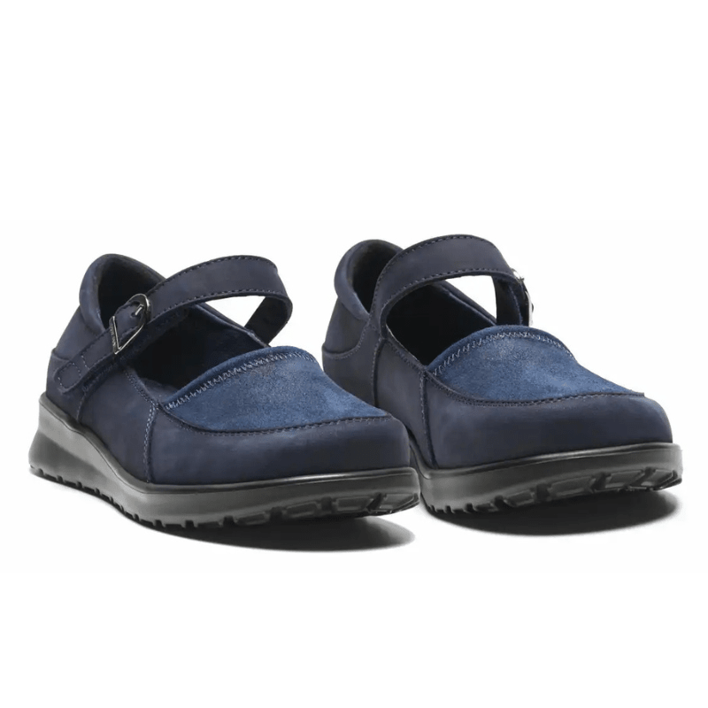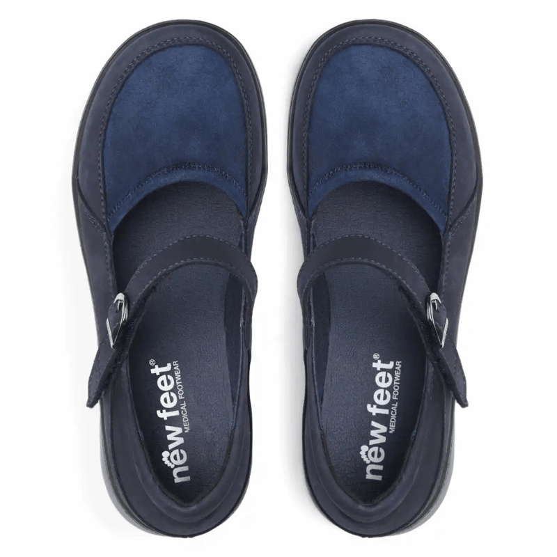 Bailarina New Feet azul oscuro en cuero suave y natural con detalles de gamuza, diseñada para ofrecer comodidad durante todo el día. El zapato cuenta con un sistema de cierre inteligente con una única correa de velcro sobre el empeine, que puede ajustarse fácilmente para lograr un ajuste óptimo.